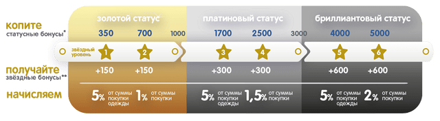 При золотой карте по достижение 350 статусных бонусов начисляется 150 звездных, при начислении 700 бонусов начисляется еще 150 звездных. При наличие платиновой карты за 1700 статусных можно получить 300 звездных бонусов, и еще 300 за 2500 статусных. При бриллиантовой карте за 4000 статусных дается 600 звездных, и за 5000 еще 600.