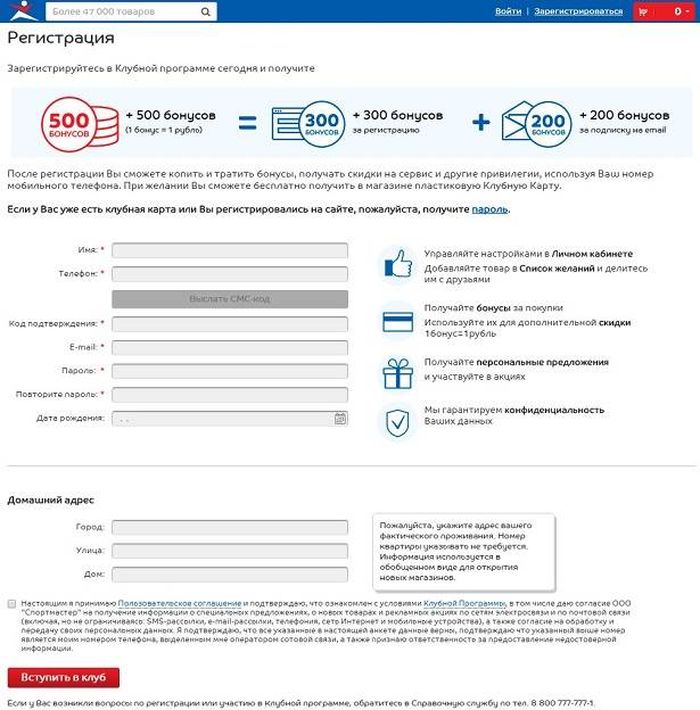 Регистрация карты спортмастер позволит получить 300 бонусов и еще 200 за подписку на email. Когда процесс регистрации будет завершен, человек сможет накапливать и тратить баллы, приобретать товары по скидкам и быть в курсе всех выгодных и заманчивых предложений, которые предлагает вниманию своих посетителей магазин. Регистрация проходит следующим образом: нужно зайти на официальный сайт www.sportmaster.ru. Там будет кнопка «Зарегистрироваться». Далее необходимо осуществить переход к странице с помещенной на ней анкетой, где участник программы должен указать личные данные (ФИО, номер телефона (на него поступит проверочный код), адрес электронной почты, пароль, год рождения, адрес и место проживания. Важность внесения информации о номере телефона объясняется тем, что на него впоследствии будут поступать последние новости об акциях и различных скидках.
