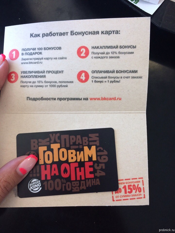 По завершении регистрации начисляется сто бонусов, который можно использовать на покупку (к примеру, человек может купить два чизбургера за 49 рублей, Чикен Бинг, Биг Кинг, стоимость которых составляет 99 рублей). Выбирая их, человек приобретает покупку, при этом не платя ни рубля! После пройденной регистрации активация отдельная или дополнительная не понадобится, поскольку процесс активации происходит автоматически. Накапливание бонусов происходит при совершении покупок с обязательным предъявлением карты.