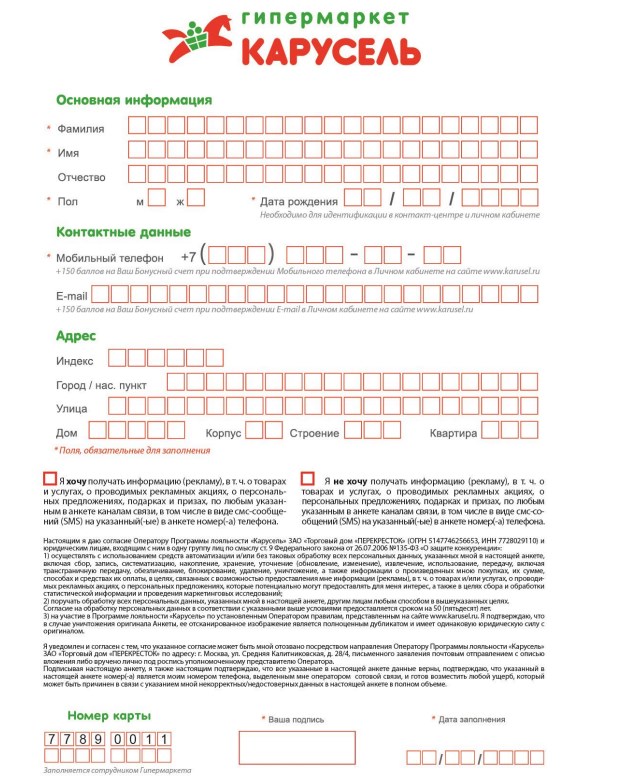 Покупатель, чтобы сдать обладателем карты и участником проводимой акции, не должен совершать покупку на крупную сумму или вносить депозит на счет. Достаточно будет лишь заплатить 9 рублей за карту и внести в предоставляемую анкету свои данные (это можно сделать в магазине или посредством входа на официальный сайт – карусель.ру).