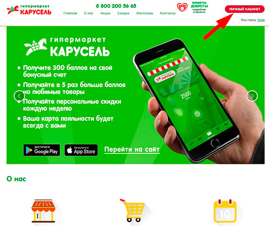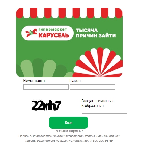 Вход по карте в личный кабинет происходит посредством указания данных ее владельца – номер карты карусель и пароль к ней. Паролем служат четыре последние цифры из всего номера карты.