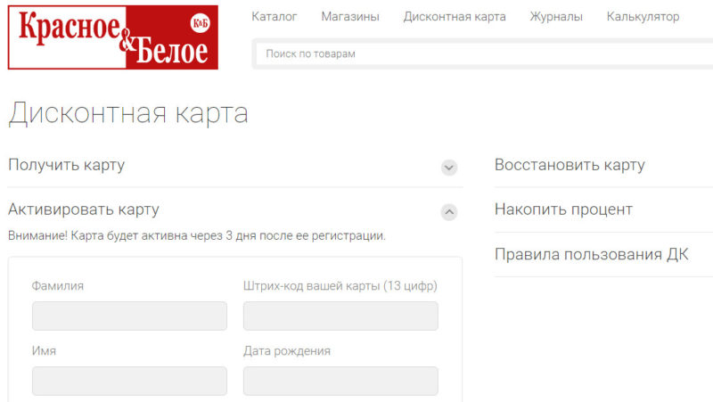 Активация карты Красное и Белое происходит следующим образом: сначала необходимо зайти на официальный сайт — Красное и Белое ру. В верхней части будет расположено меню, здесь нужно нажать на пункт «Дисконтная карта». В меню, расположенном вертикально, нажать на раздел «Активировать карту».