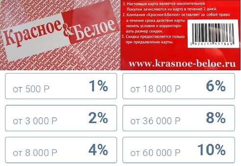 Дисконтная карта Красное и Белое позволяет приобретать алкогольную продукцию по более низким, привлекательным и демократичным ценам. Это выгодная бонусная система, делающая процесс покупок еще более приятным и желанным.