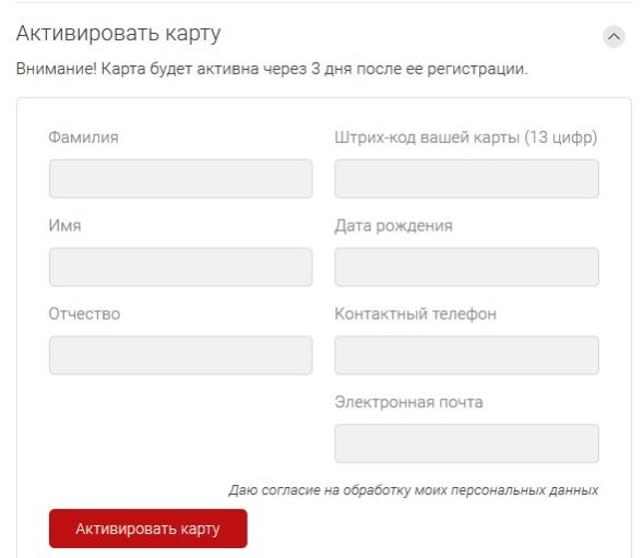 На экране отобразится форма активации, куда заносятся данные: фамилию, имя, отчество, номер карты и мобильного телефона. Далее человек дает согласие на то, чтобы предоставленная личная информация была обработана, и нажимает «Активировать карту».