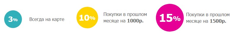 Дисконтный скидочный размер распространяется на следующий месяц и зависит от покупок в месяц посещения магазина. Текущая скидка предоставляется 3%, соответственно 10 и 15% зависит от стоимости покупки на 1000 рублей и 1500 рублей. Если у вас намечается день рождение, то чем больше покупок вы совершите за месяц до этого праздника, тем больше себя порадуете в следующем месяце, так на покупку до 1000 распространяется скидка 10% и с каждыми 500 рублями она возрастает на 5%, начиная от 1000 руб. В день именин предоставляется скидка 20%, свой день можно узнать в официальной группе ВКонтакте магазина. Ежедневно до 12:00 на весь ассортимент предоставляется скидка 5%.